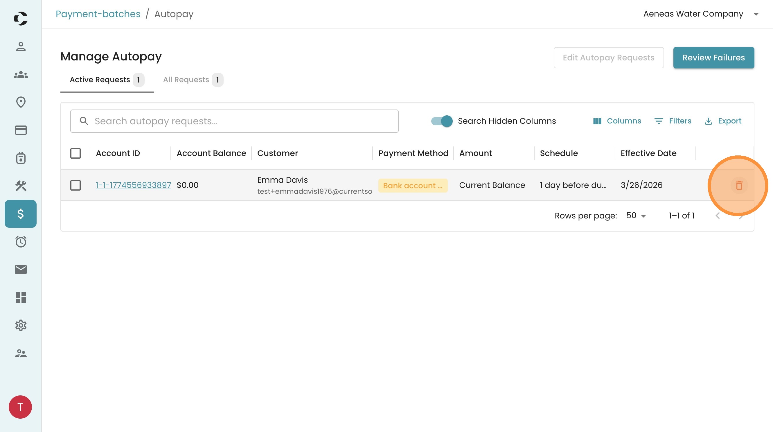 3. Search for the account you need to update. Autopayments can be deleted by hovering over the row and clicking on the trash icon