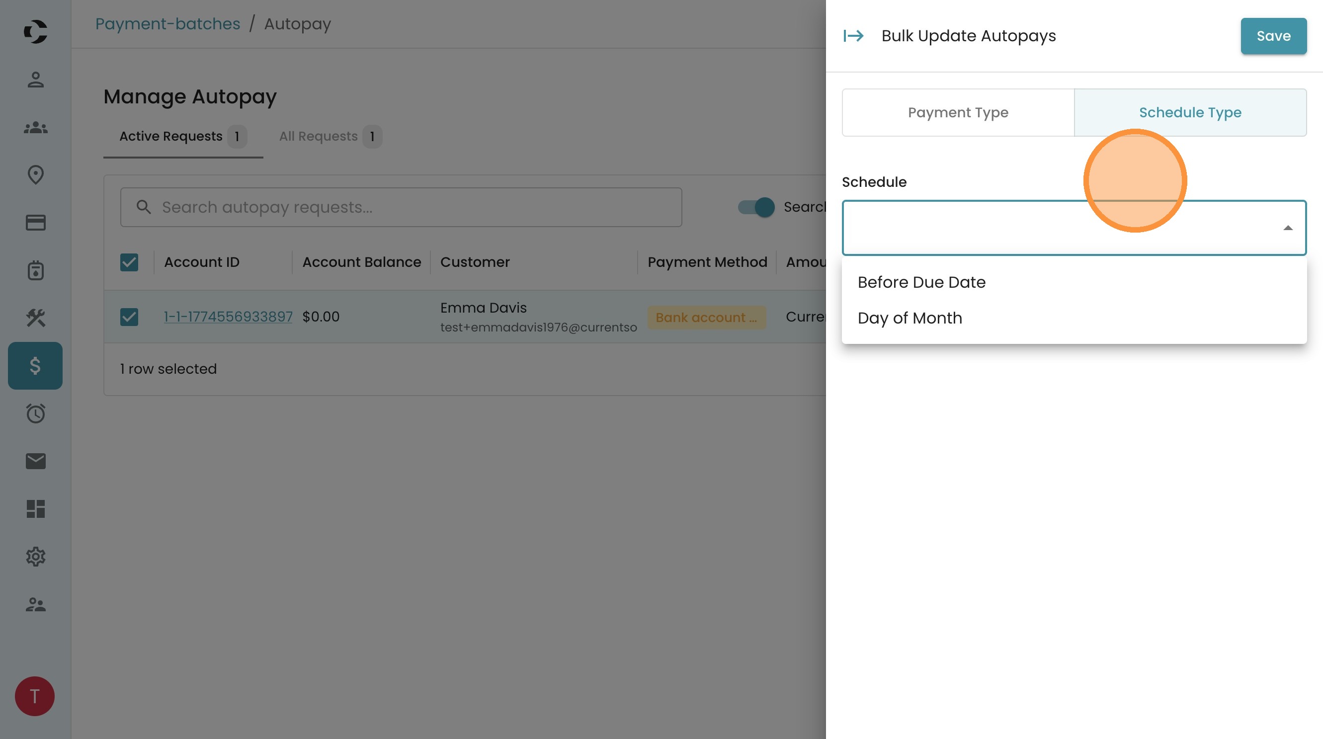 7. You can modify the payment schedule by clicking the Schedule Type tab and selecting Before Due Date or Day of Month.